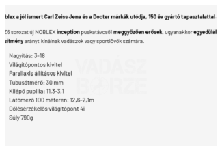 Vadász optika / Céltávcsövek / Kínál / Docter / Noblex Inception 3-18x56 / új / variable / Világítópontos / ***3-18x56 / Eladó egy rendkívül keveset használt vadászati céltávcső, még 7 év garanciával! Adok hozzá 2 db Rusan szereléket. Az ár minimálisan alkuképes. Albertirsán átvehető. Tel: +36202783159 /